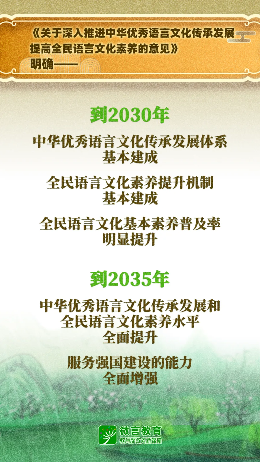 到2030年,中华优秀语言文化传承发展体系基本建成,实现科学阐释、教育普及、资源开发、数字赋能、队伍建设、推广传播、交流互鉴等协同发展;全民语言文化素养提升机制基本建成,全民语言文化基本素养普及率明显提升。到2035年,中华优秀语言文化传承发展和全民语言文化素养水平全面提升,服务强国建设的能力全面增强。